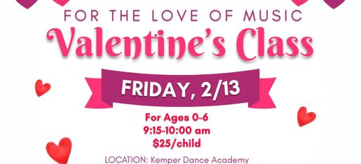 For this season of love, give your little one age 0-6 the gift of song! Join us on Friday, February 13th, at 9:15 am at Kemper Dance Academy for our For the Love of Music Valentine's Day Class! Space is limited, so don't delay. Register today!